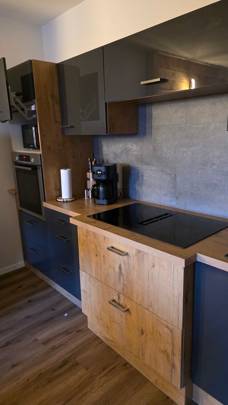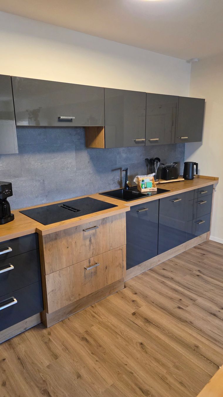 Die moderne Küche ist voll ausgestattet und lädt zum gemeinsamen Kochen ein. Das stilvolle Bad mit Dusche sorgt für zusätzlichen Komfort während Ihres Aufenthalts.